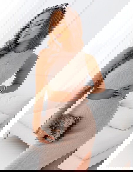Beżowy prążkowany komplet top+spódnica z rozcięciem Perlla